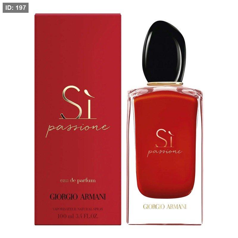 Sì Passione Giorgio Armani عطر زهري - فواكه للنساء . Sì Passione صدر عام 2017. Sì Passione من توقيع Christine Nagel و Julie Massé. إفتتاحية العطر الكمثري, الكشمش الأسود, الفلفل الوردي و الجريب فروت; قلب العطر الأناناس, الورد, الياسمين و الهيلوتروب; قاعدة العطر تتكون من الفانيليا, خشب الأرز, الباتشولي و خشب العنبر.