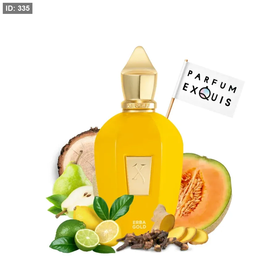 Erba Gold Xerjoff عطر للجنسين. Erba Gold صدر عام 2016. إفتتاحية العطر البرتقال البرازيلي, الليمون الصقلي, برغموت كالابريا و الزنجبيل; قلب العطر شمام, الكمثري, التفاح الأخضر, القرفة, الهيل من غواتيمالا و القرنفل; قاعدة العطر تتكون من المسك الأبيض, فانيليا مدغشقر, العنبر و الأخشاب.